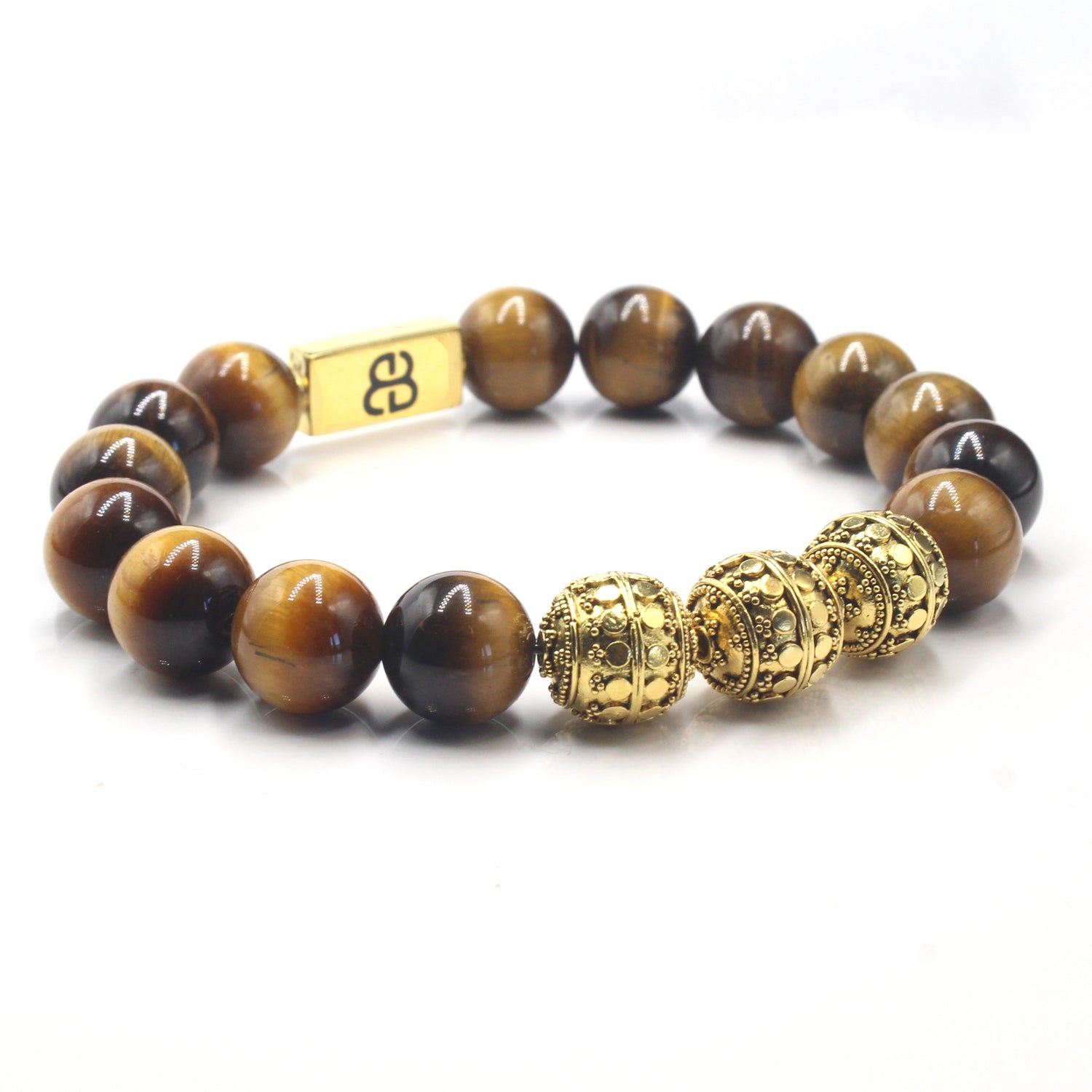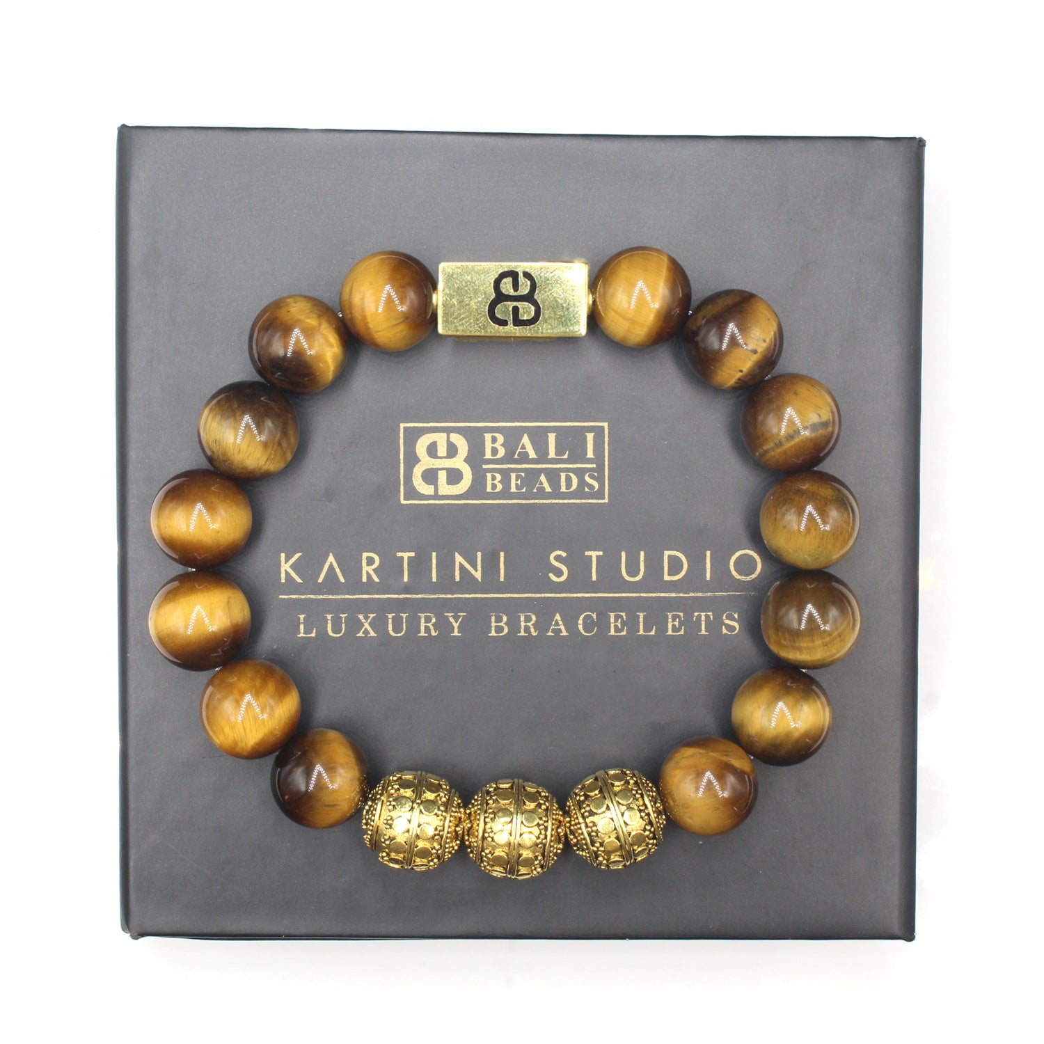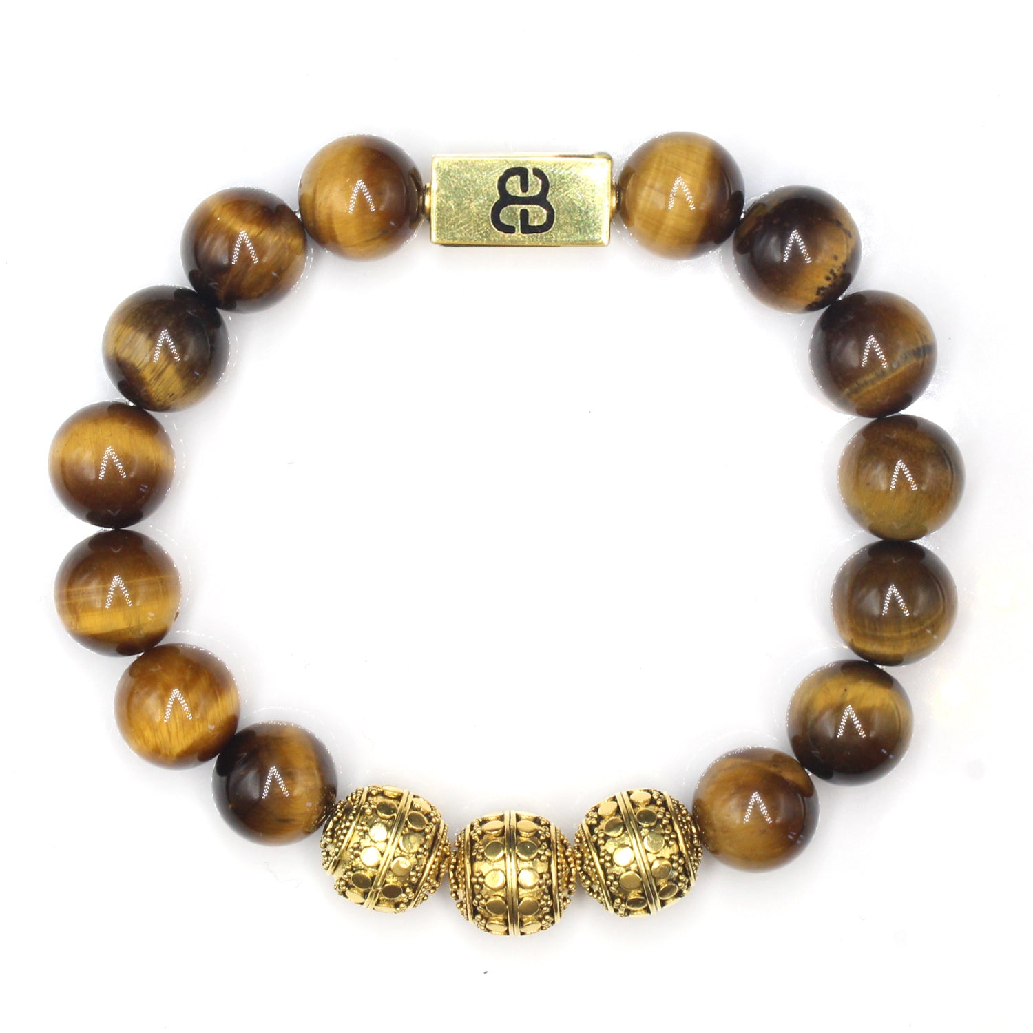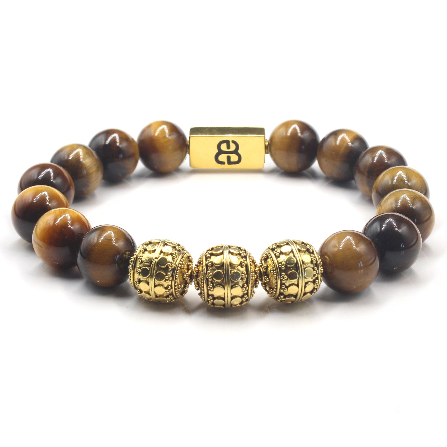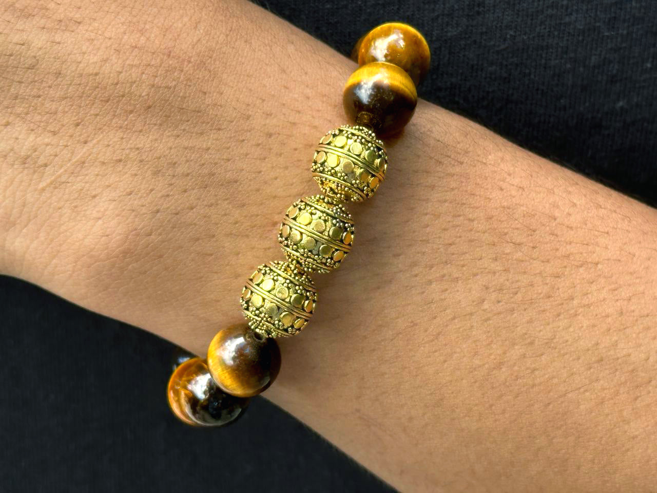 This bracelet features Grade A Tiger's Eye beads accented with three 12mm 22 karat gold plated solid sterling silver Bali Beads and a 16mm x m 22 karat gold plated solid sterling silver "Bali Beads" logo bead. The gold is gently oxidized to create the blackened "antique" effect.