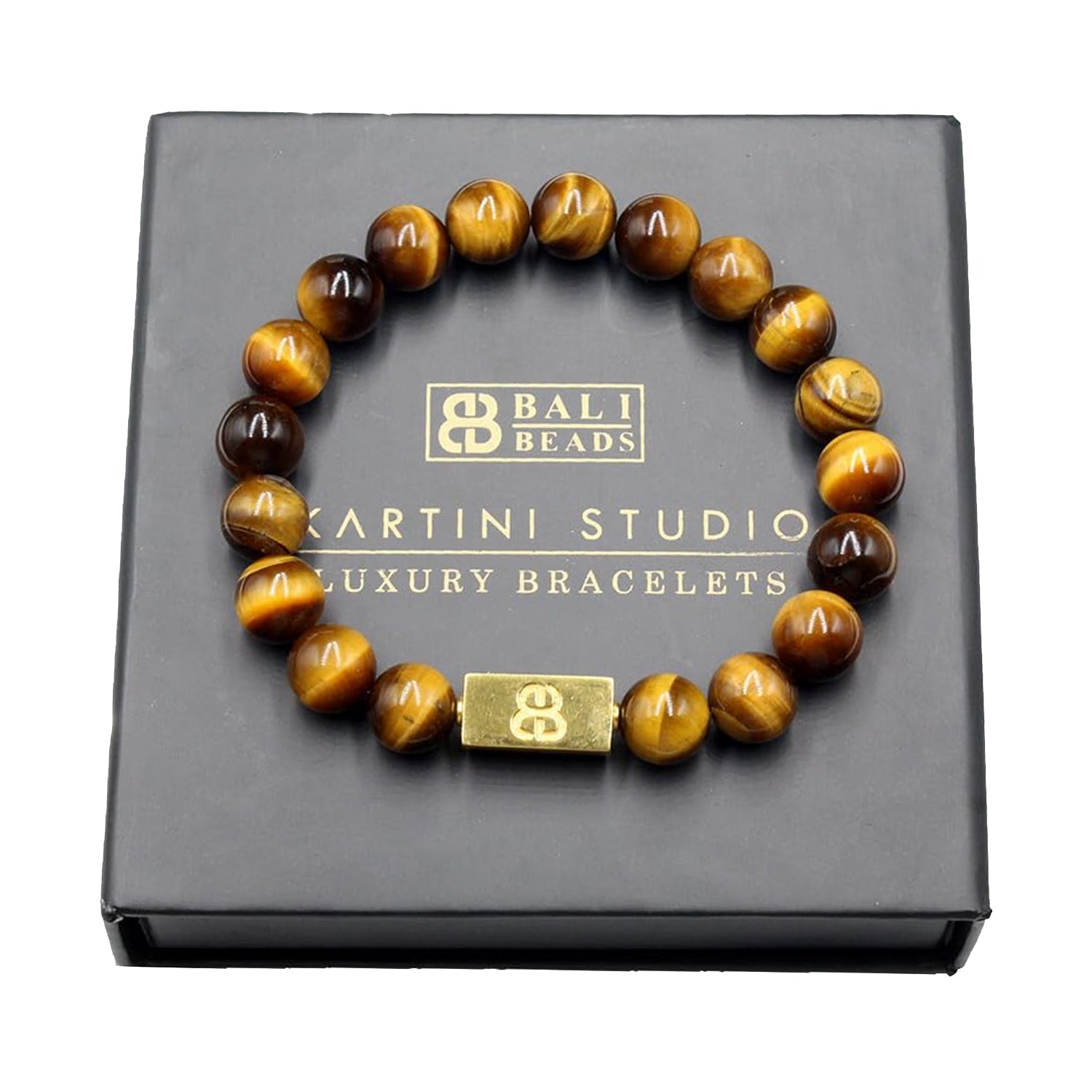 - This bracelet features 10mm Tiger’s Eye beads accented with a 16mm x 8mm 22 karat gold plated solid sterling silver “Bali Beads” logo bead.