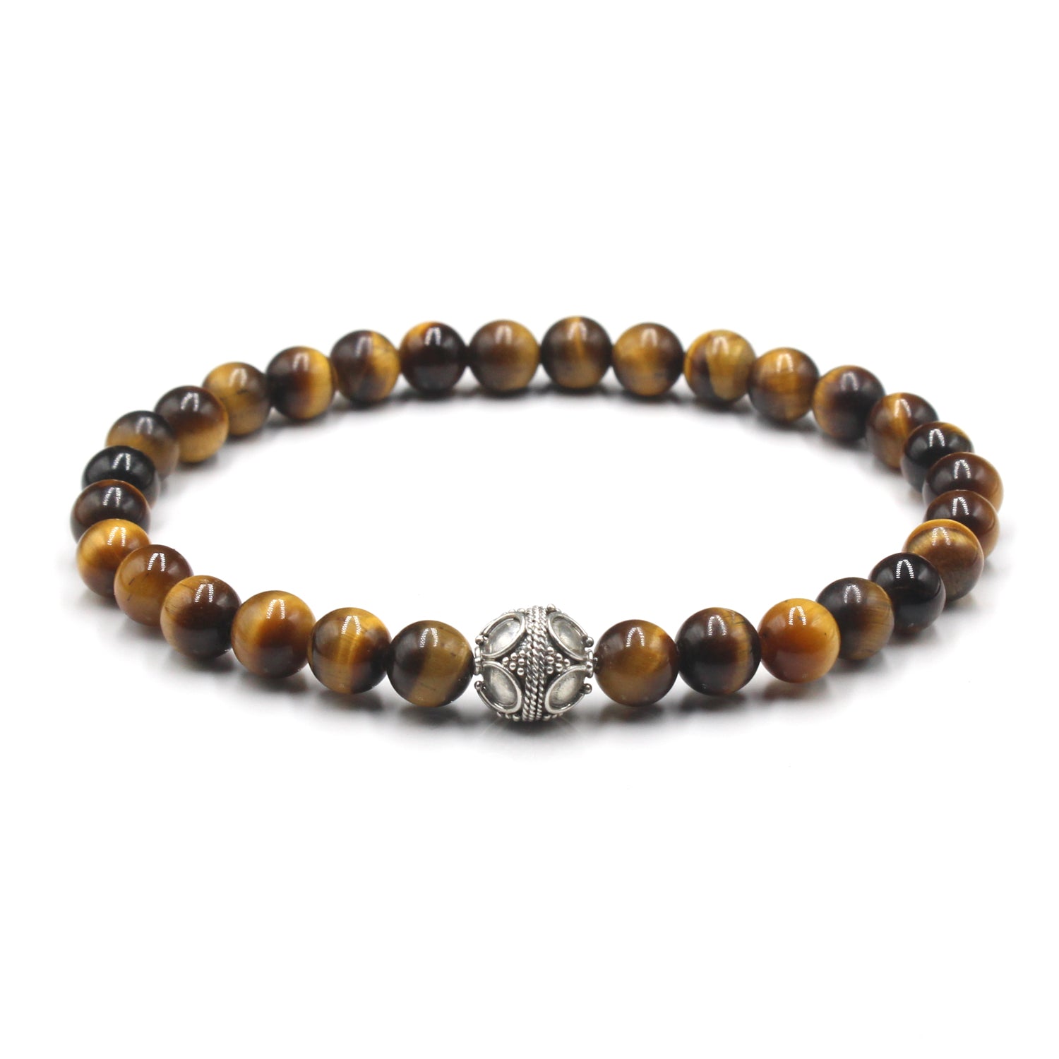 This bracelet features 6mm tiger's eye beads accented with a handmade 8mm sterling silver Bali Bead.