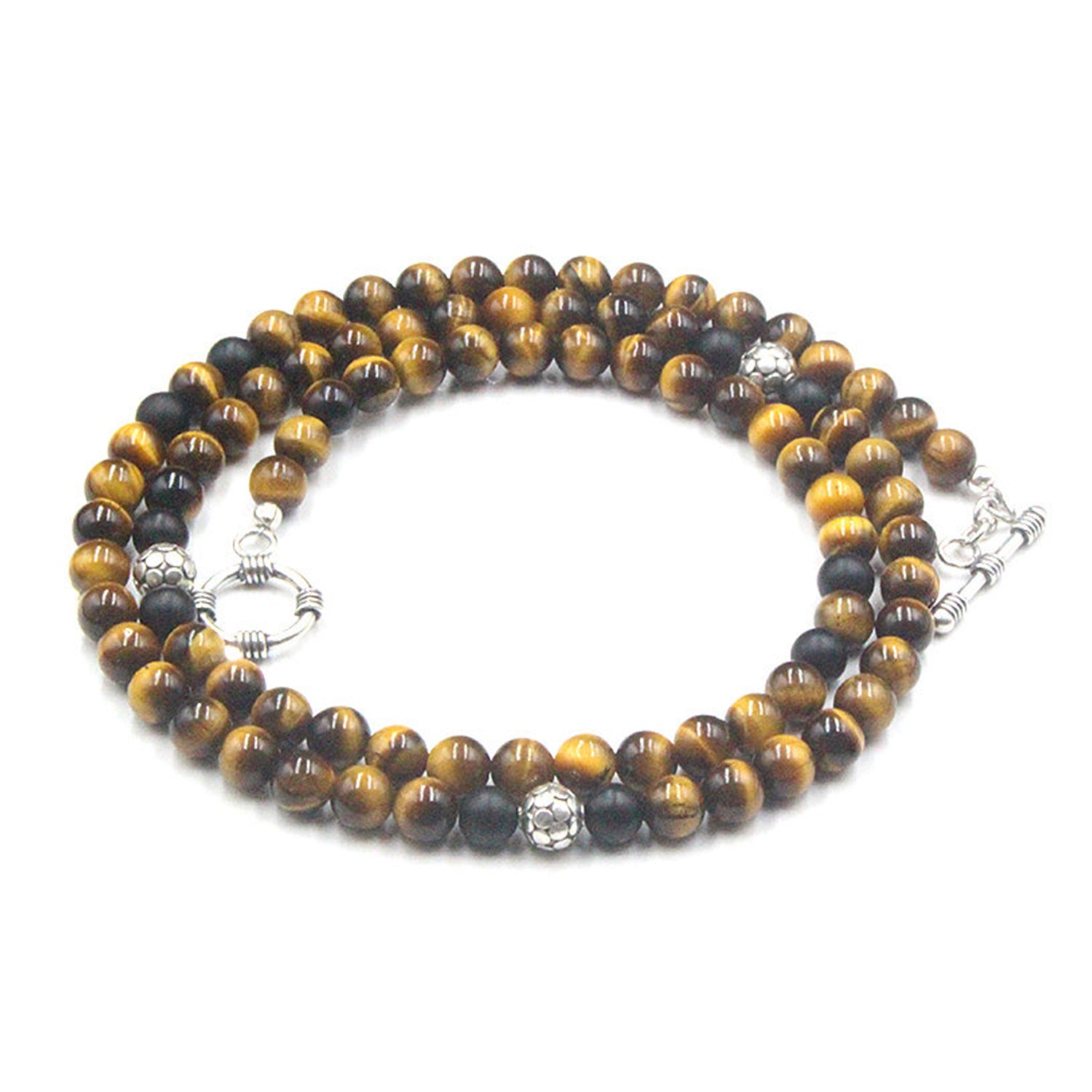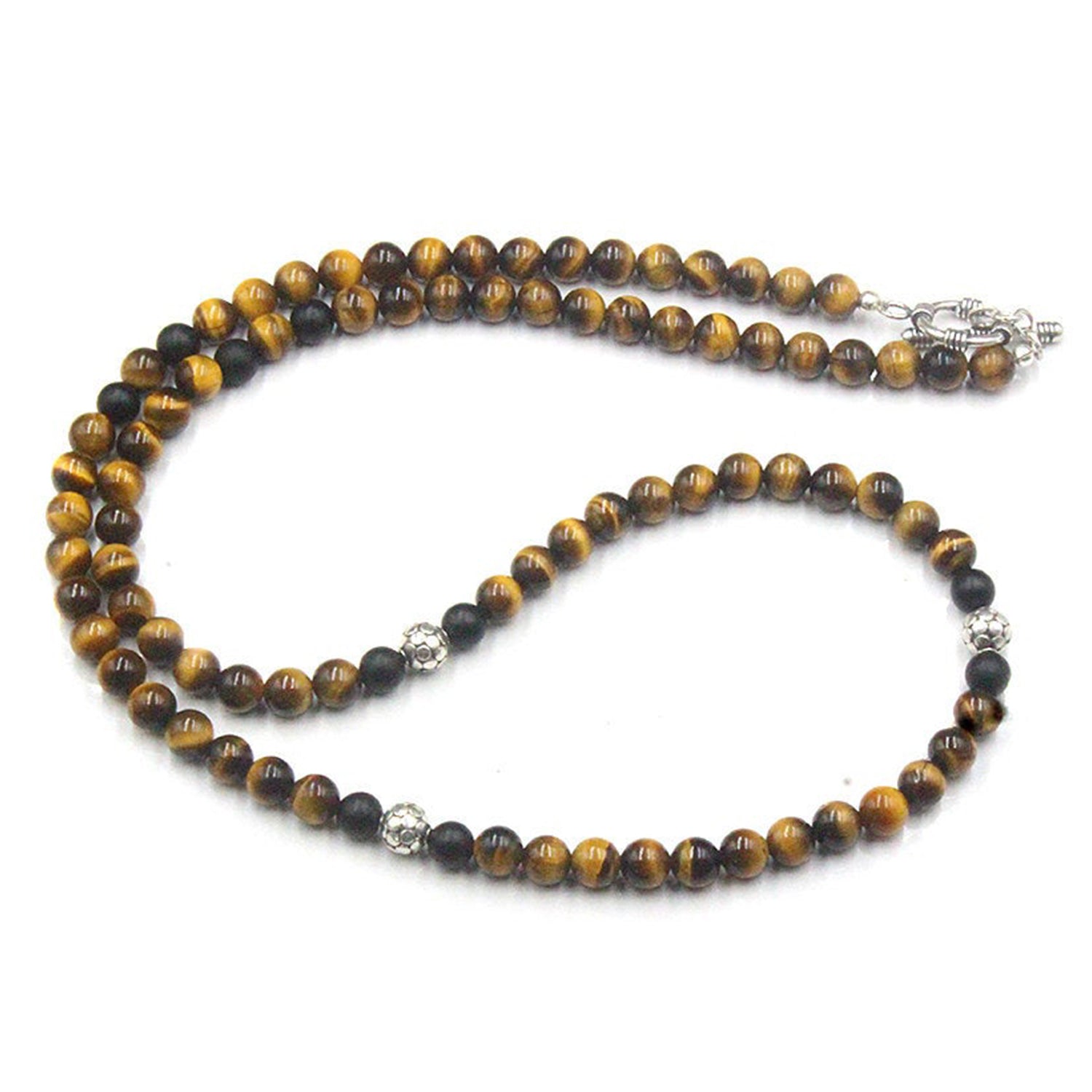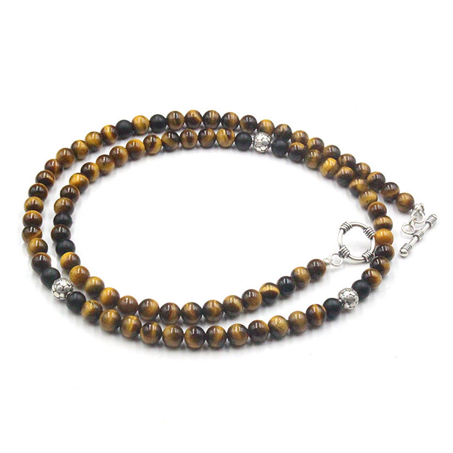 This necklace features 6mm Grade A tiger's eye beads and 6mm matte black onyx beads accented with three handmade 6mm sterling silver beads. The clasp is a 16mm solid sterling silver toggle clasp. Choose your necklace size from the drop down menu