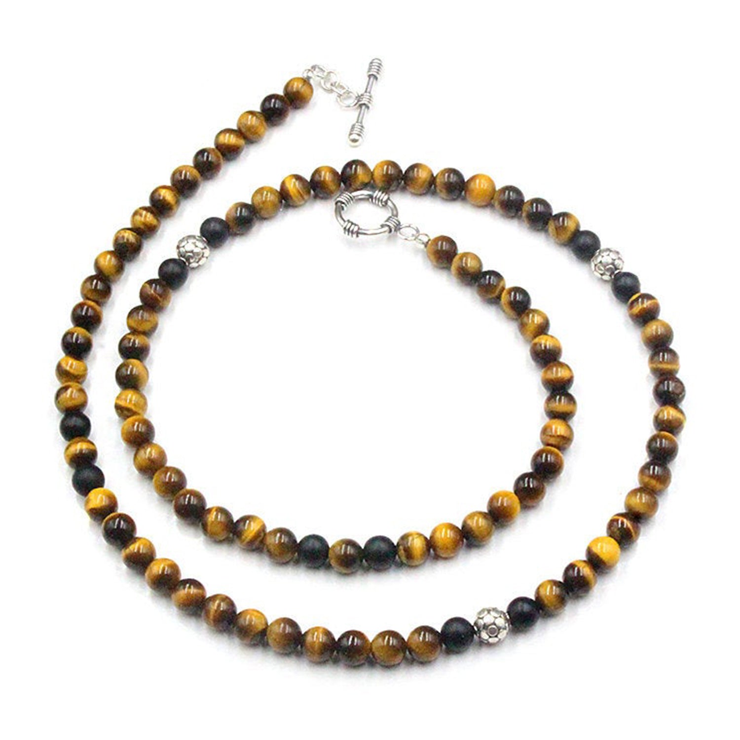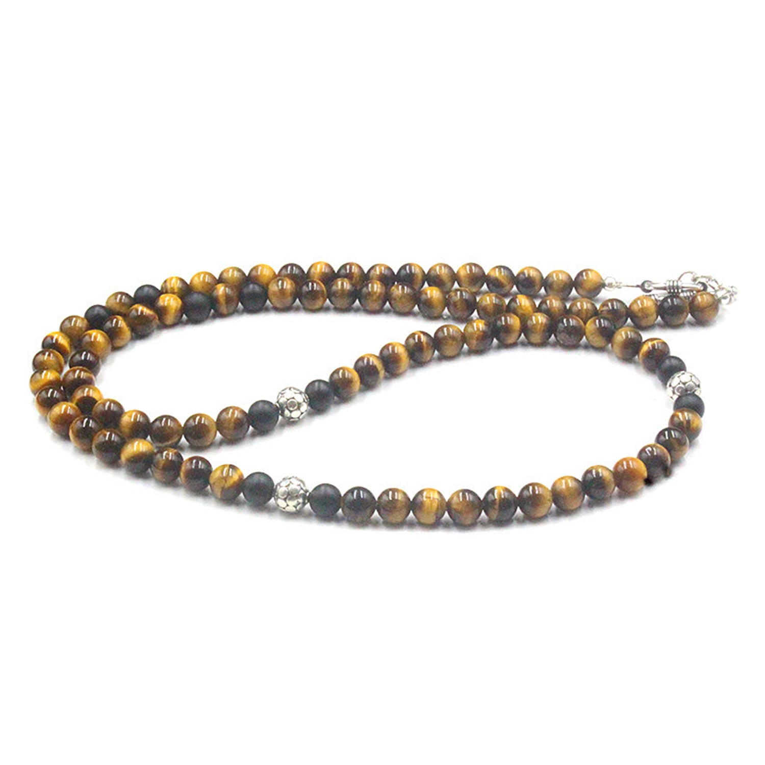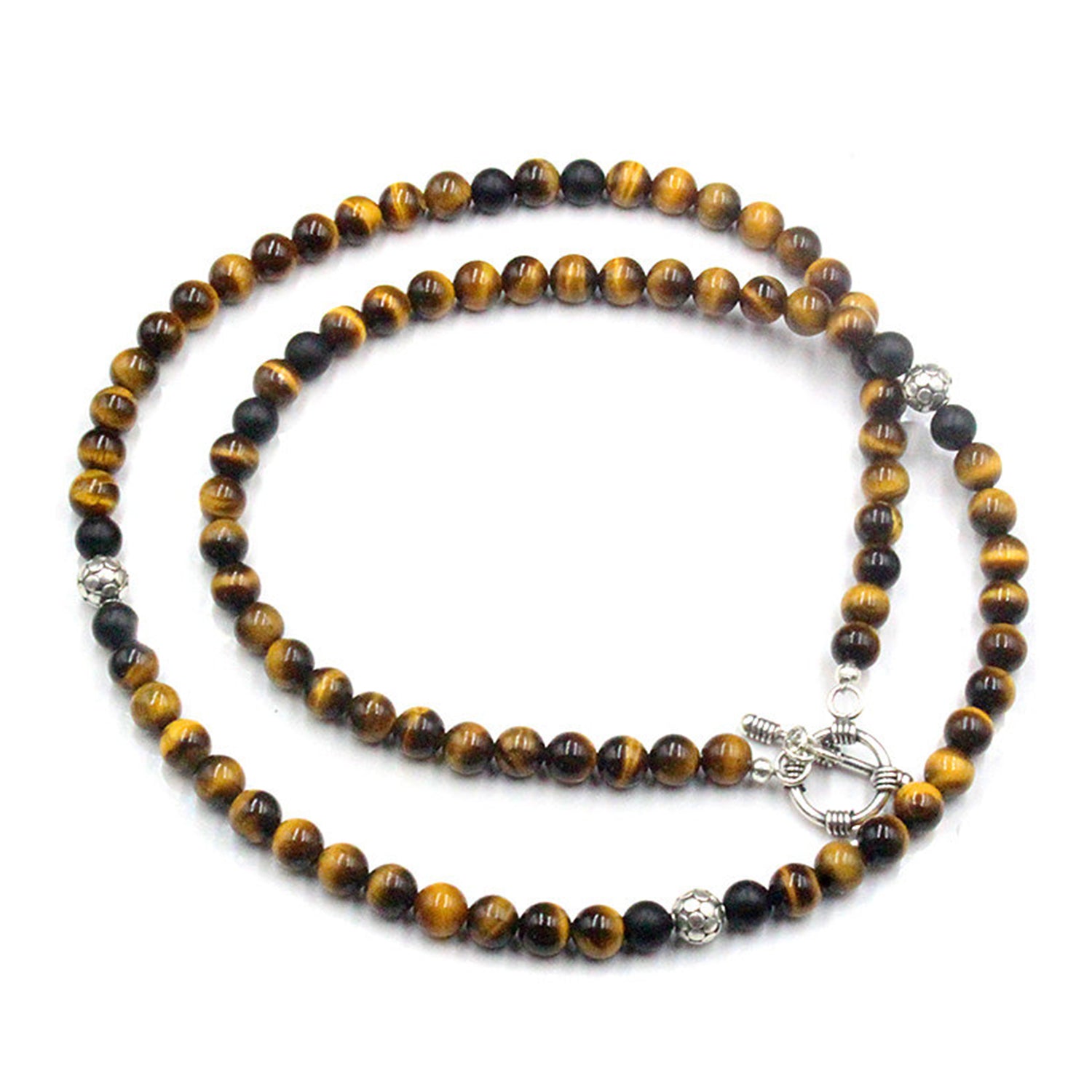This necklace features 6mm Grade A tiger's eye beads and 6mm matte black onyx beads accented with three handmade 6mm sterling silver beads. The clasp is a 16mm solid sterling silver toggle clasp. Choose your necklace size from the drop down menu