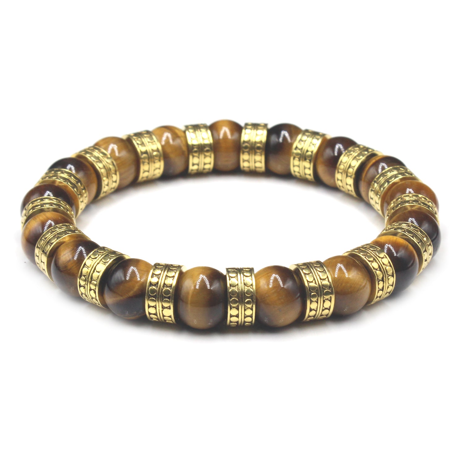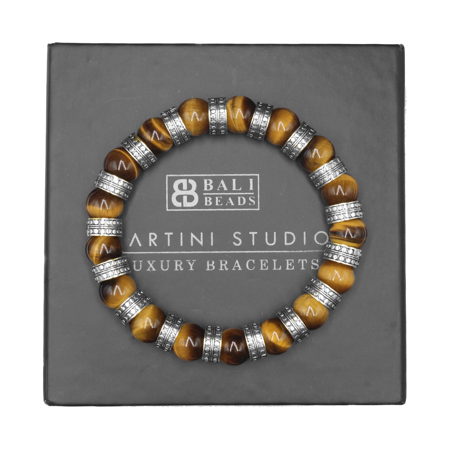 This bracelet features 10mm Grade A Tiger's Eye stone beads with solid sterling silver hammered "dots" beads.