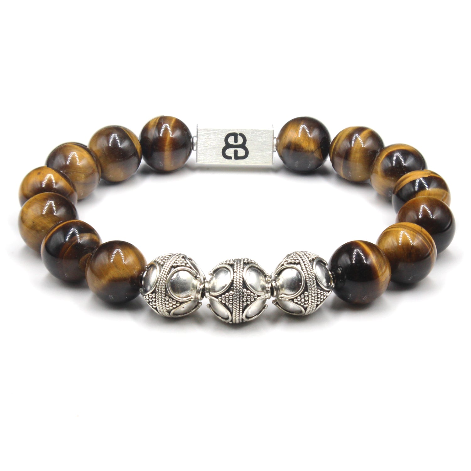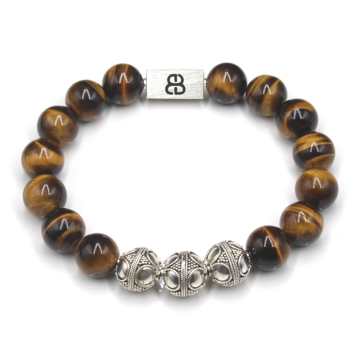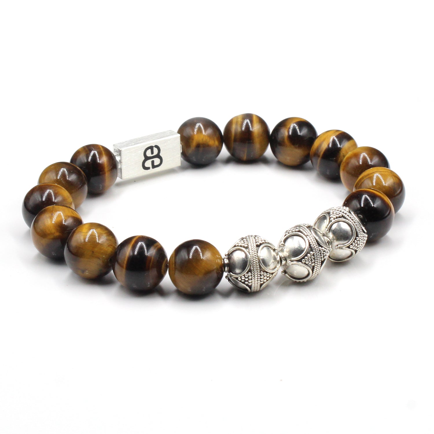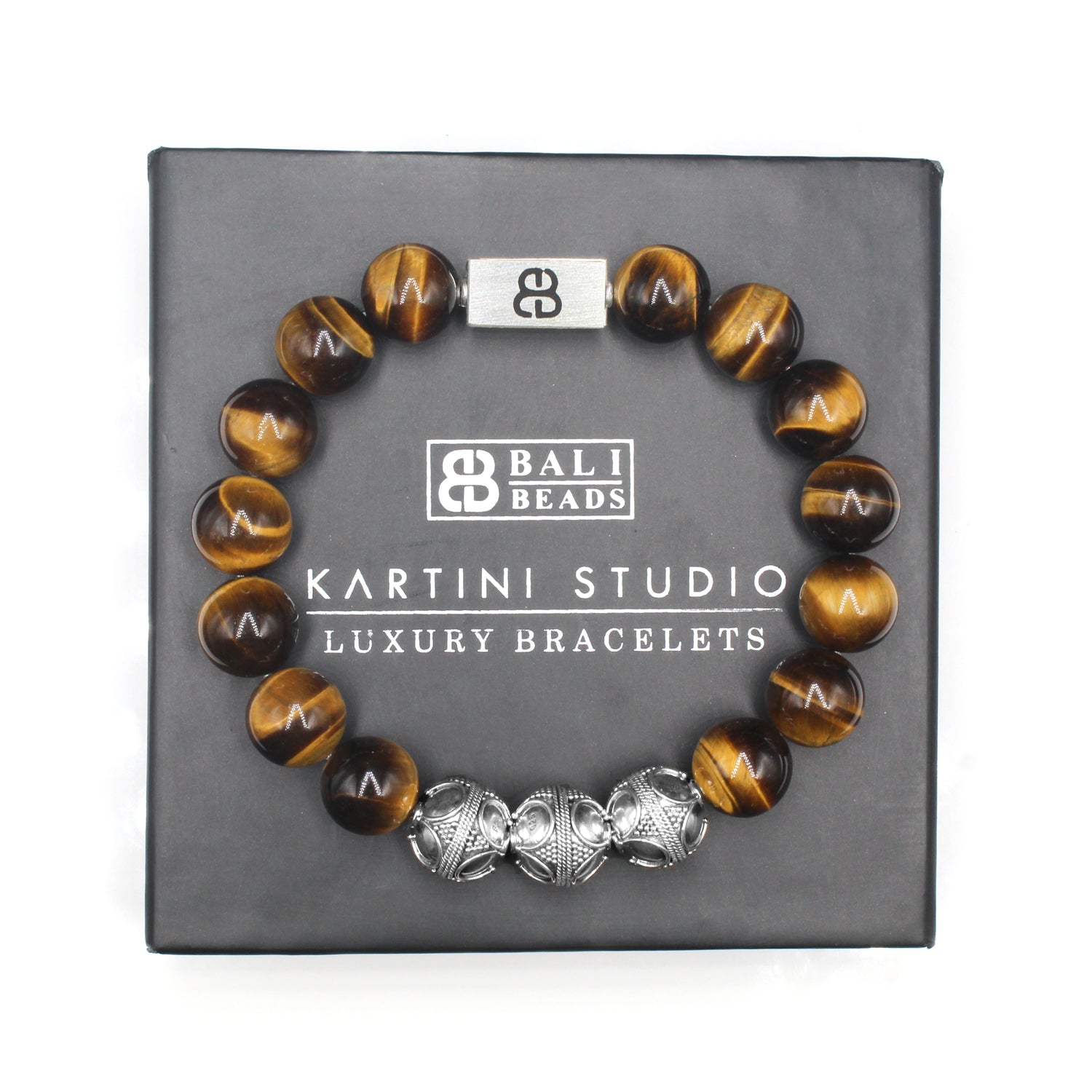 This bracelet features 12mm tiger's eye gemstone beads accented with three handmade 12mm .925 sterling silver Bali beads and a 8mm x 8mm solid sterling silver "Bali Beads" logo anchor bead.