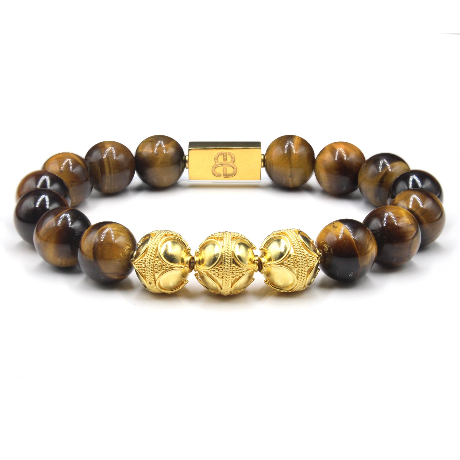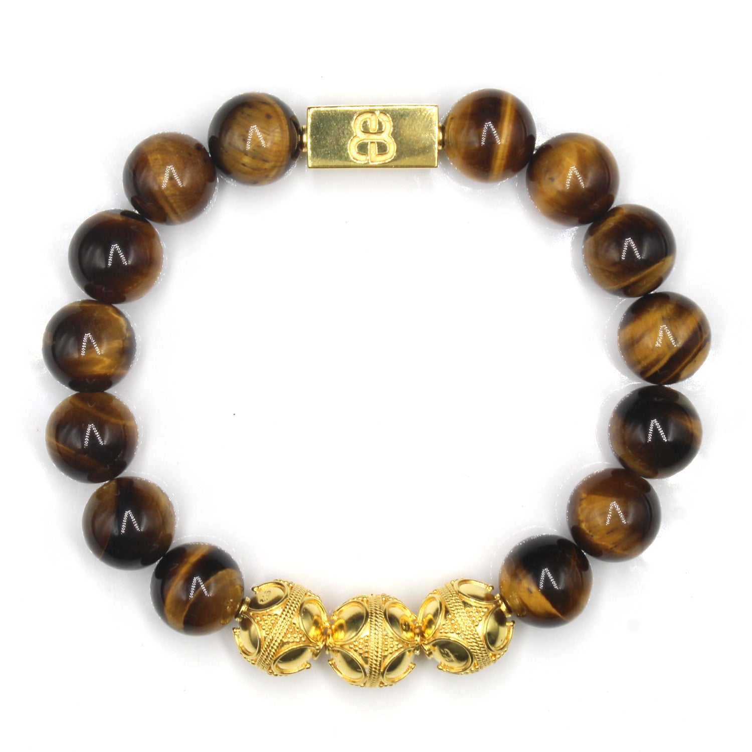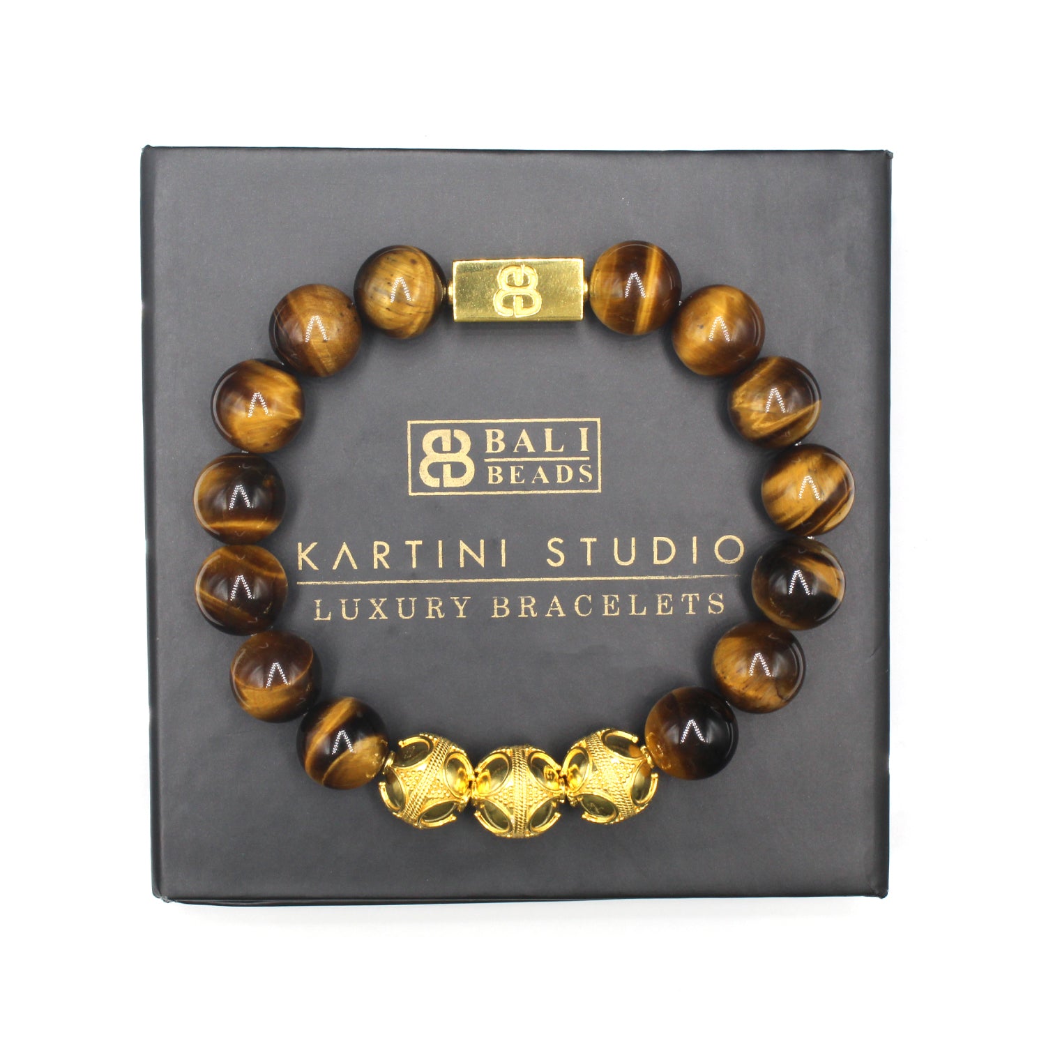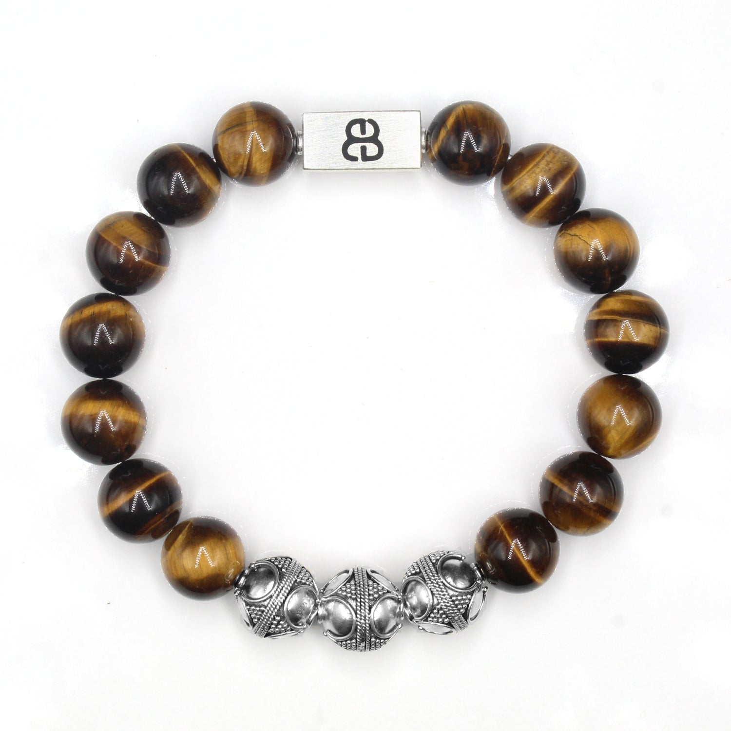 This bracelet features 12mm tiger's eye gemstone beads accented with three handmade 12mm .925 sterling silver Bali beads and a 8mm x 8mm solid sterling silver "Bali Beads" logo anchor bead.