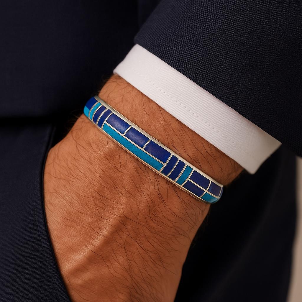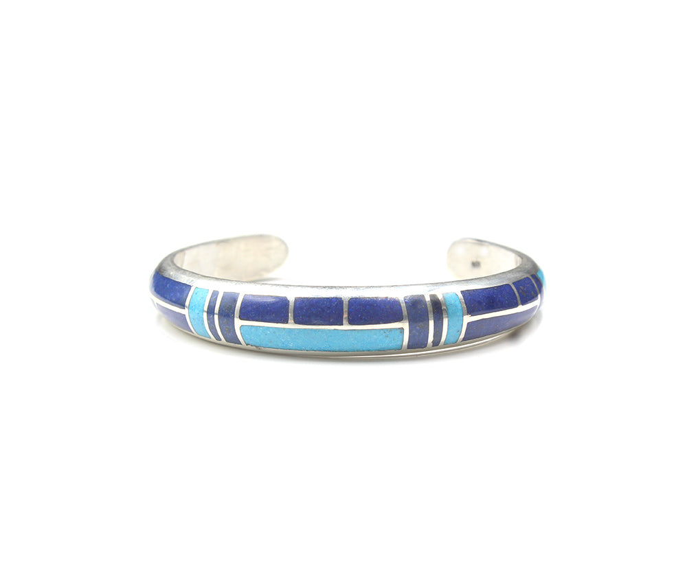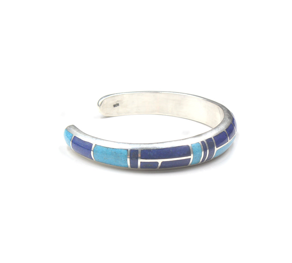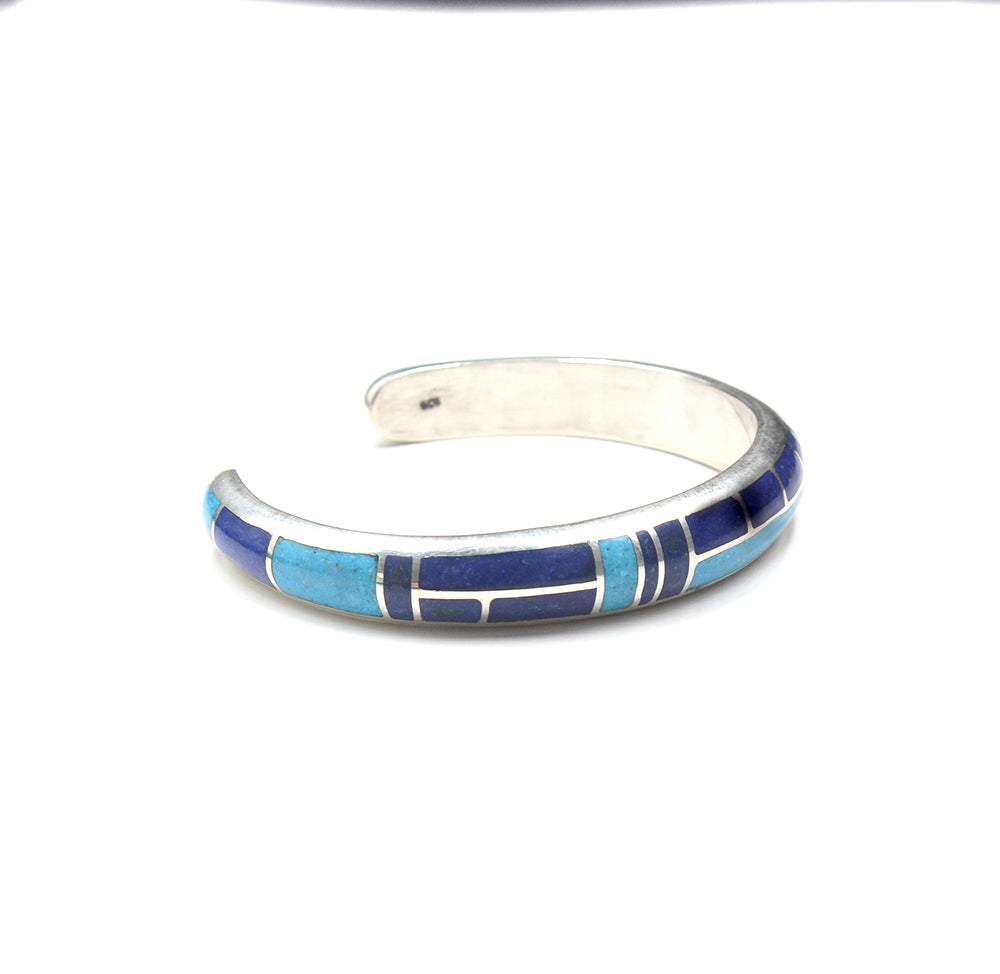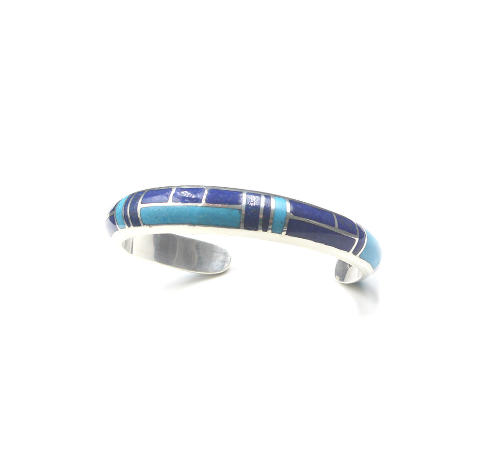 This is a heavy duty sterling silver cuff bracelet made with inlaid natural turquoise and natural lapis lazuli stone. The width is 12mm, tapering to 8mm. The thickness is 6 mm. The gap is 1.25 inches for a man's wrist size; 1 inch for a woman's wrist size. Select your wrist size from the drop down menu, and we will make your bracelet to fit. Please measure your wrist size if you are unsure of the size. Solid sterling silver and stone inlay bracelets cannot be changed. No returns are accepted unless the item is defective. Your bracelet comes in a bracelet gift box. Below is a link demonstrating the correct way to put on a cuff bracelet: https://www.youtube.com/watch?v=bU6QwykAo7w
