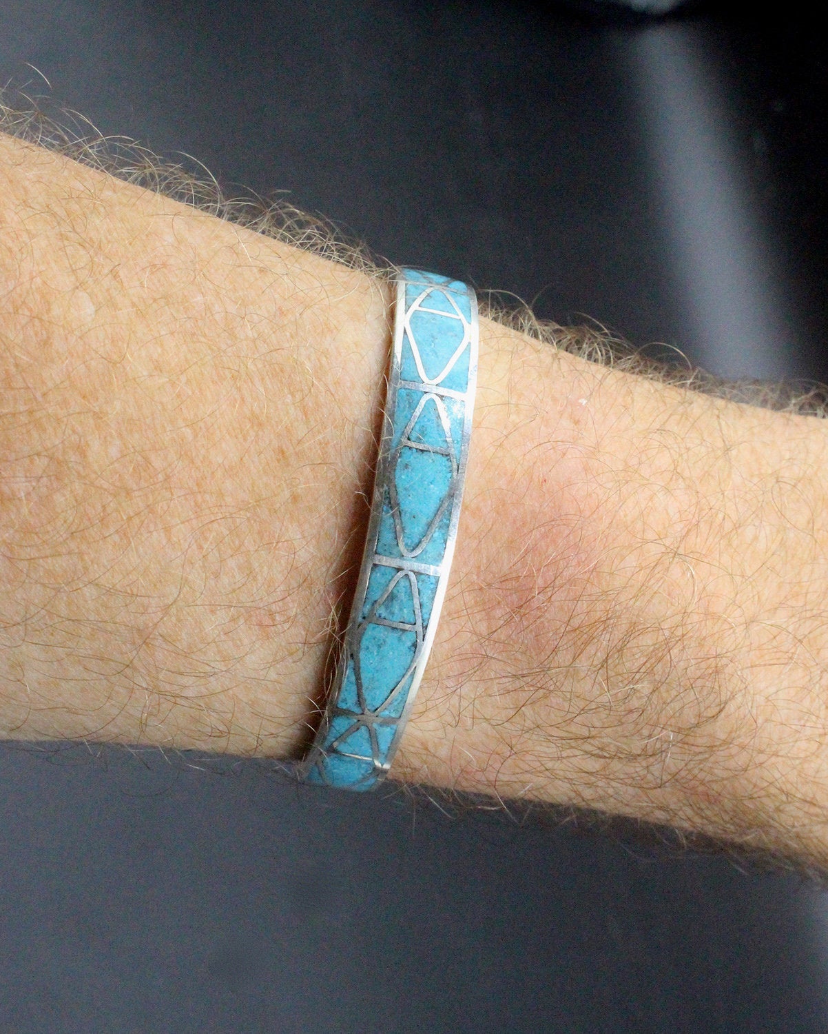 This is a heavy duty sterling silver cuff bracelet with inlaid crushed natural turquoise stone. The bracelet width is 10mms. The gap is 1.25 inches for a man's wrist size; 1 inch for a woman's wrist size. Select your wrist size from the drop down menu. We will make your bracelet to fit. Please measure your wrist size if you are unsure of the size. Sterling silver and stone inlay bracelets cannot be altered afterwards. No returns are accepted unless the item is defective. It takes approximately two weeks to make this bracelet. Your bracelet comes in a gift box. Please contact us if you have any questions. Below is a link demonstrating the correct way to put on a cuff bracelet: https://www.youtube.com/watch?v=bU6QwykAo7w