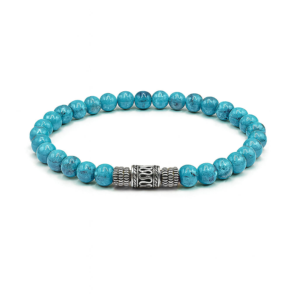 This bracelet features 6mm stabilized turquoise beads, accented with a handmade 6mm x 9mm sterling silver bead and sterling silver spacers.